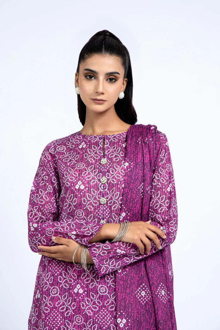 A head turner outfit in magenta color with chunri print pattern shirt, premium lawn printed dupatta and a matching cambric trouser will surly lift your summer wardrobe