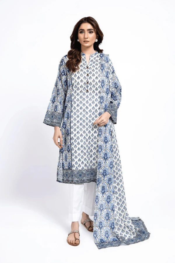 Printed 2 pc ensemble with flat collar and placket adorned with buttons. This printed lawn shirt and lawn dupatta can be easily carried with white trouser to give a summary look.