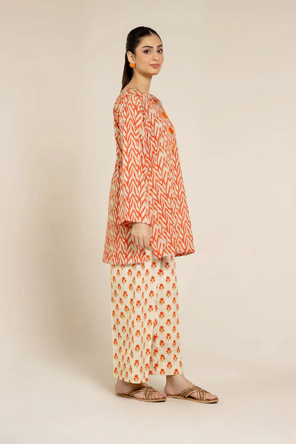 2pc pret in which printed shirt comes with round neckline and placket with button details ,full sleeves and a printed trouser to complete the look